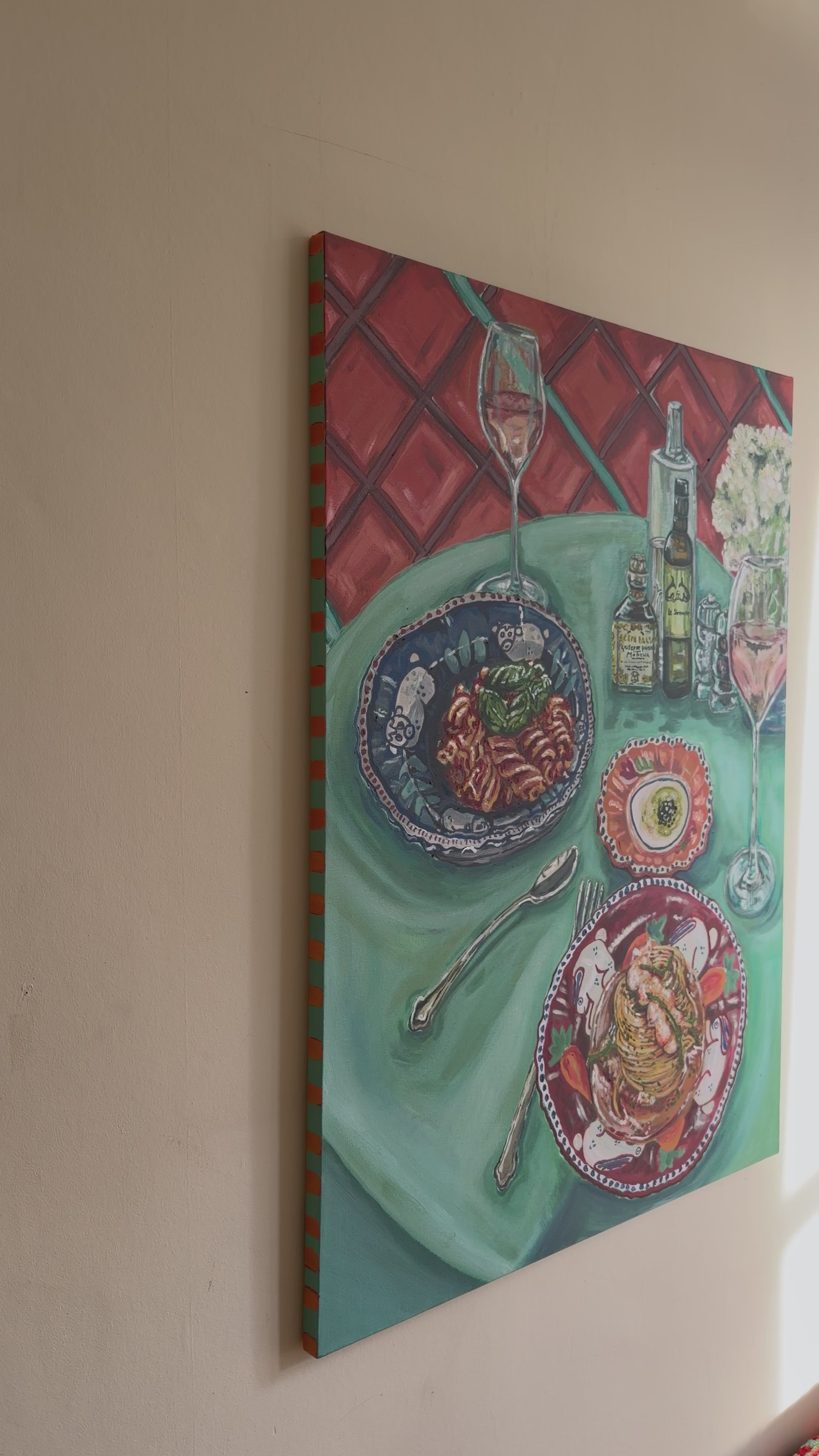 This painting is inspired by a trip to the Amalfi Coast, sharing pasta in Positano at La Sponda in Le Sirenuse. Prawn linguine and tomato basil pomodoro are served on hand-painted plates, overlooking Spiaggia Grande below. The work captures the colour and warmth of the moment ; sun-washed terraces, coastal air, and the pleasure of a simple meal framed by one of Italy’s most iconic views.