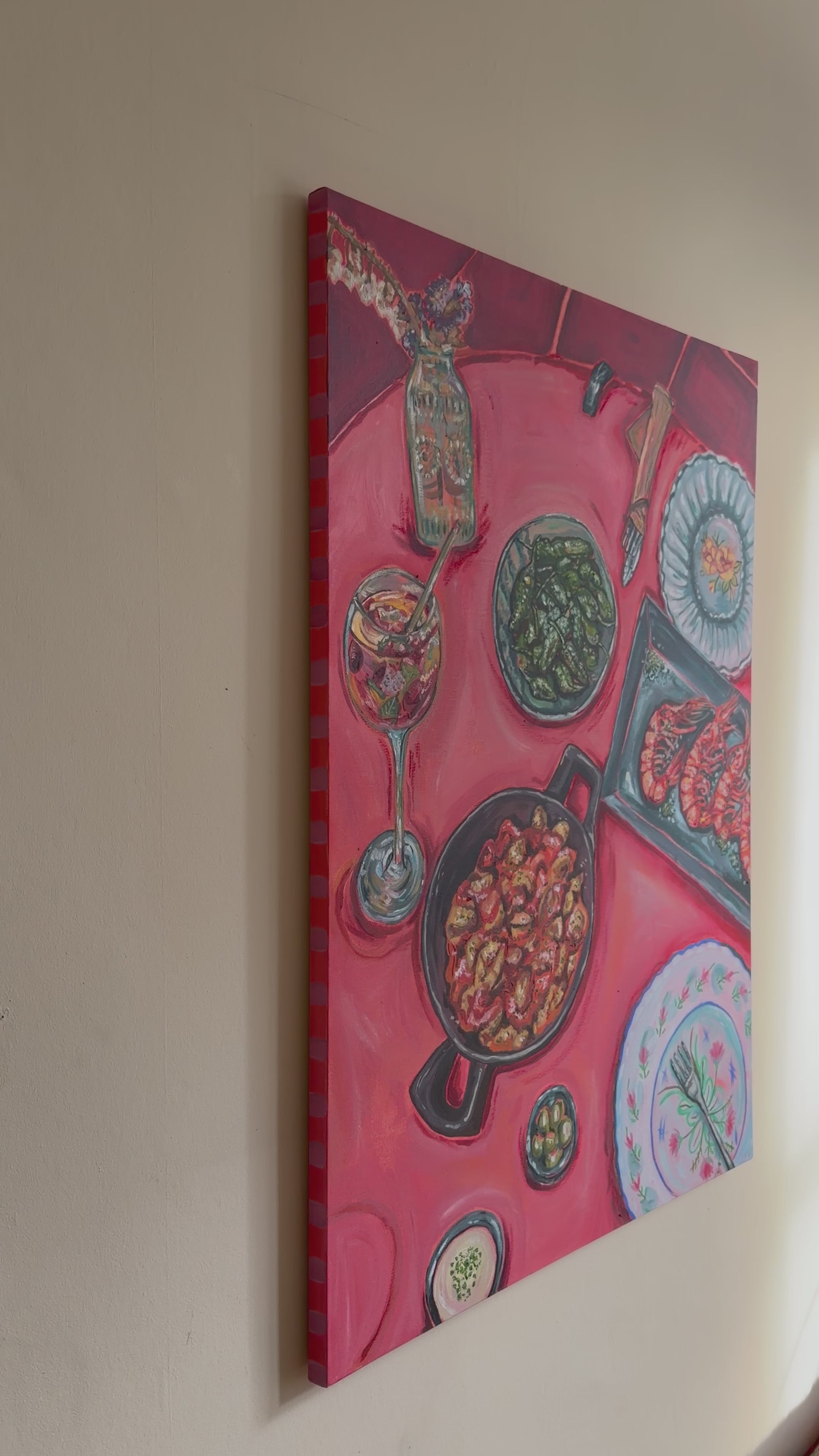 This painting is inspired by an early evening at Tapas Ibiza in San Antonio; fruity sangria spritz on the table, salty padrón peppers, patatas bravas, fresh olives, extra aioli and grilled red king prawns. It captures that in-between moment before the night begins, when the light turns golden and the energy starts to lift, just ahead of a sunset boogie at Sunset Ashram.
